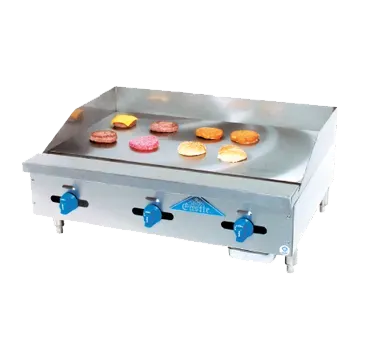 Transform your kitchen with top-of-the-line cooking gear. Introducing the Comstock-Castle 3236MG Gas Countertop Griddle, designed to elevate your commercial restaurant experience. This griddle features a spacious 36" wide x 32" deep frame, providing ample cooking space for high-volume operations. The 36" wide x 24" deep x 1" thick polished steel griddle plate ensures even heat distribution and excellent heat retention, allowing for consistent and efficient cooking. With three manual controls, you have precise control over each section of the griddle, ensuring perfect results every time. The 3" splash guard on the back and ends keeps your kitchen clean and safe, while the 3-1/2" wide front grease trough and large removable grease drawer make cleaning a breeze. Made with a durable stainless steel exterior and equipped with 4" adjustable feet, this griddle is built to withstand the demands of a busy commercial kitchen. With a powerful 75000 BTU, this NSF-certified griddle delivers exceptional performance and reliability. Upgrade your kitchen with the Comstock-Castle 3236MG Gas Countertop Griddle and experience the difference in quality and efficiency.