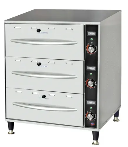 Elevate your culinary operations with our state-of-the-art Food Warming Drawer, designed to meet the rigorous demands of any bustling kitchen. This free-standing countertop marvel boasts a robust stainless steel frame, ensuring both durability and a sleek, professional look. With dimensions of 23-3/4"W x 21"D x 33.75"H, it fits seamlessly into a variety of kitchen layouts, providing exceptional versatility. Equipped with three spacious drawers, each accommodating three 12" x 20" x 6" pans, this warmer is perfect for keeping large quantities of food at the ideal serving temperature. The intuitive thermostat control panel allows precise temperature adjustments from 80 degrees F to 220 degrees F, while the on-off indicator lamp provides easy monitoring. Advanced venting control ensures even heat distribution across all drawers, maintaining the perfect texture and flavor of your dishes. Operating at 120v/60/1-ph with 900 watts and 7.5 amps, it is efficient and powerful, featuring a NEMA 5-15 plug with a 6-foot cord for convenient placement. Certified by cULus and NSF, this Food Pan Warmer guarantees both safety and quality, making it an indispensable asset for restaurants, catering services, and more. Experience unparalleled performance and reliability with our premium food warming solution.