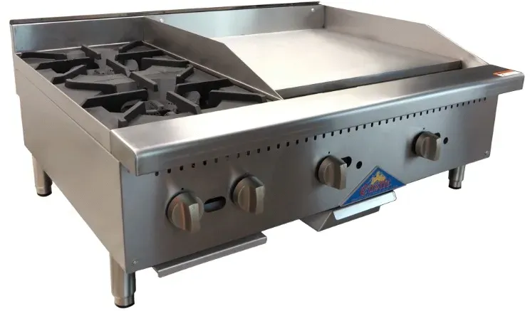 Elevate your culinary prowess with our premium countertop gas hotplate and griddle combination, designed to meet the demanding needs of any professional kitchen. This robust 36-inch by 30.2-inch unit seamlessly integrates power and versatility, featuring two high-performance cast iron saute burners, each delivering an impressive 25,000 BTU output. The 12" x 12" cast iron hotplate grates are perfect for handling diverse cooking tasks with precision. Complementing the burners is a sleek 24-inch by 20.8-inch griddle, crafted with a 3/4" thick smooth, high-polish surface that ensures even heat distribution for perfect sears and sauteing. The standing pilot ignition system offers reliable performance, while the stainless steel exterior and adjustable no-skid legs provide durability and stability, essential for bustling kitchens. With four intuitive manual controls, you're empowered with precise heat management over a total of 110,000 BTUs. Designed for natural gas use at sea level, this unit includes a convenient LP gas conversion kit, ensuring adaptability. Certified by cCSAus and CSA Sanitation, this griddle and hotplate combo is your ticket to transforming any culinary challenge into a masterpiece, making it an indispensable asset for chefs who demand nothing but the best.