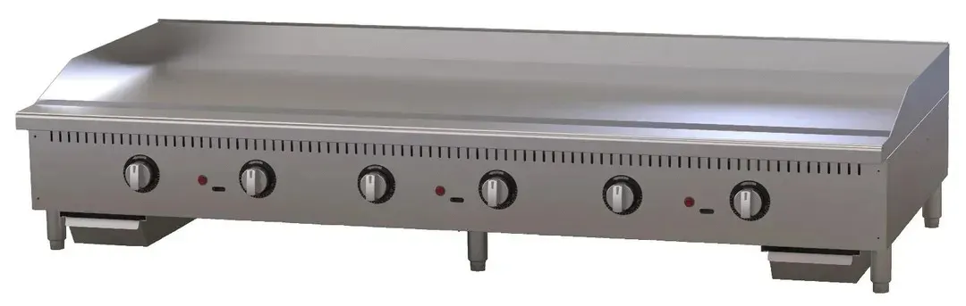 Elevate your culinary operations with our top-of-the-line countertop gas griddle, designed for both performance and durability in bustling commercial kitchens. This impressive 72-inch wide, 33-inch deep unit features a robust polished steel griddle plate that stands at 72 inches wide, 24.5 inches deep, and a full inch thick, ensuring even heat distribution and a perfect cook every time. Engineered with precision, our griddle boasts reliable brass manual control valves, allowing chefs to maintain exacting temperature control for all your grilling needs. The double welded splash guard provides an added layer of protection, keeping your workspace clean by preventing spills along the inner seams and underneath. For convenience, the griddle is equipped with a front grease trough and two large removable grease drawers, making cleanup a breeze. The sleek stainless steel exterior not only adds a touch of professionalism but is also easy to maintain, while the adjustable feet ensure stability on any surface. Delivering a powerful 180,000 BTUs, this griddle comes with a gas conversion kit included, offering flexibility with a 3/4" gas connection. With certifications from cETLus, ETL Sanitation, and NSF, you can trust this griddle to meet the highest standards of safety and performance, making it an indispensable asset to your kitchen arsenal.