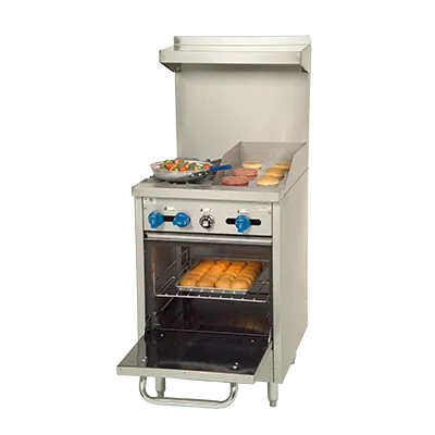 Upgrade your kitchen capabilities with the Comstock-Castle F318-12 Range. Designed specifically for commercial restaurant use, this gas range offers top-tier performance and durability. With its two 24,000 BTU star burners and 12" square cast iron grates, you can easily cook multiple dishes simultaneously, saving time and increasing efficiency. The range also features a 12" - 3/4" thick griddle with manual controls, perfect for preparing delicious breakfast items or grilled sandwiches. The space-saver oven with enamel door and bottom linings provides ample space for baking and roasting, while the rack with three positions allows for versatile cooking options. The stainless steel exterior back riser and high shelf add a sleek and professional look to your kitchen. With 6" stainless steel legs and a height of 37" to the cook surface, this range is ergonomically designed for ease of use. Upgrade your restaurant kitchen today with the Comstock-Castle F318-12 Range.