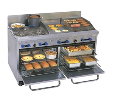 Introducing the Comstock-Castle F3226-18-1.5RB Range, a game-changer in the world of commercial restaurant cooking. This 60" wide gas range is designed to redefine the art of cooking, offering exceptional performance and versatility. Equipped with four 24000 BTU star burners and 12" square cast iron grates, this range ensures even heat distribution and precise control over your culinary creations. The 18" - 3/4" thick griddle and 18" char-broiler with iron radiants add further flexibility to your menu options. With two standard ovens featuring enamel door and bottom linings, you can effortlessly handle high-volume cooking. The stainless steel exterior and 7" high backguard not only enhance durability but also make cleaning a breeze. Standing at 37" tall to the cook surface, this range offers ergonomic convenience. With a powerful 201000 BTU output, NSF certification, and cETLus compliance, the Comstock-Castle F3226-18-1.5RB Range is the perfect choice for any commercial restaurant seeking to elevate their culinary experience.
