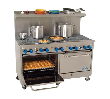 Stay competitive with innovative culinary solutions with the Comstock-Castle F3226-24-2RB Range. Designed specifically for commercial restaurant use, this gas range offers exceptional performance and versatility. With a width of 60 inches, it features two 24,000 BTU star burners with 12-inch square cast iron grates, perfect for high-volume cooking. The range also includes a 24-inch griddle with manual controls and a 24-inch char-broiler with iron radiants, allowing you to prepare a variety of dishes simultaneously. The two standard ovens, equipped with enamel door and bottom linings, provide ample space for baking and roasting. Each oven comes with a rack and three positions for flexible cooking options. The stainless steel exterior and 7-inch high backguard ensure durability and easy cleaning. With a total BTU of 198,000, this NSF and cETLus certified range is a reliable and efficient addition to any commercial kitchen. Upgrade your restaurant's cooking capabilities with the Comstock-Castle F3226-24-2RB Range.