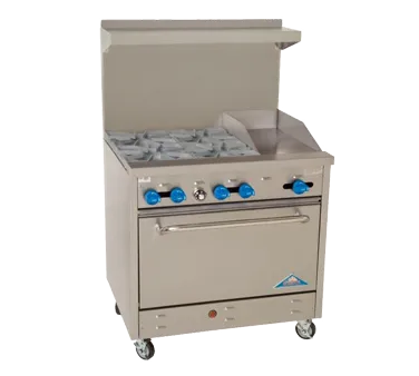 Introducing the Comstock-Castle F330-12 Range, a game-changer for commercial restaurant kitchens. With its innovative solutions for mastering the art of cuisine, this gas range is a must-have for any professional chef. Boasting a 36" wide design, it features four 24000 BTU star burners with 12" square cast iron grates, ensuring even heat distribution and precise cooking control. The range also includes a 12" - 3/4" thick griddle with manual controls, perfect for whipping up delicious breakfast favorites. The extra-wide 31" oven with enamel door and bottom linings provides ample space for baking multiple dishes simultaneously, while the included rack with three positions allows for versatile cooking options. Made with a stainless steel exterior, back riser, and high shelf, this range is not only durable but also easy to clean. With a 146000 BTU rating, this NSF and cETLus certified range delivers exceptional performance, making it a reliable choice for any commercial kitchen. Upgrade your restaurant's cooking capabilities with the Comstock-Castle F330-12 Range.