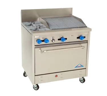 Crafting success in every culinary creation, the Comstock-Castle F330-2RB Range is a must-have for any commercial restaurant. With its 36" width, this gas range offers ample space for cooking multiple dishes simultaneously. Equipped with two 24,000 BTU star burners and 12" square cast iron grates, it ensures efficient heat distribution and even cooking. The 24" char-broiler with iron radiants adds versatility to your menu, allowing you to grill mouthwatering steaks and burgers to perfection. The extra-wide 31" oven features enamel door and bottom linings, providing durability and easy cleaning. With a rack that offers three positions, you can easily adjust the cooking height to accommodate different dishes. The stainless steel exterior and 7" high backguard not only enhance the range's durability but also give it a sleek and professional look. Standing at 37" tall to the cook surface, this range offers convenience and comfort during cooking. With a powerful 128,000 BTU output, this NSF and cETLus certified range delivers exceptional performance, making it a reliable choice for any commercial kitchen.