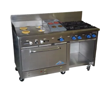 Set the culinary standard with top-tier equipment. Introducing the Comstock-Castle F33032-30-1.5RB Range, 60" Restaurant, Gas. This range is designed to meet the demands of a commercial restaurant kitchen, offering exceptional performance and durability. With two 24,000 BTU star burners and 12" square cast iron grates, you can easily cook multiple dishes simultaneously. The 30" griddle with manual controls allows for precise temperature adjustments, while the 18" char-broiler with iron radiants delivers that perfect flame-kissed flavor. The extra-wide 31" oven features enamel door and bottom linings, along with a rack with three positions for versatile cooking options. The 22" wide cabinet base storage area provides ample space for storing kitchen essentials. Made with a stainless steel exterior and a 7" high backguard, this range is not only functional but also visually appealing. With a 168,000 BTU rating, NSF certification, and cETLus approval, this Comstock-Castle range is the ideal choice for any commercial restaurant.
