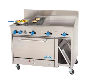 Upgrade your kitchen capabilities with top-tier equipment. The Comstock-Castle F3430-24-1RB Range is a game-changer for commercial restaurants. With its impressive features and exceptional performance, this gas range is designed to meet the demands of a busy kitchen. The 48" wide range boasts two 24000 BTU star burners with 12" square cast iron grates, ensuring even heat distribution and efficient cooking. It also includes a 24" griddle with manual controls and a 12" char-broiler with iron radiants, allowing for versatile cooking options. The extra-wide 31" oven with enamel door and bottom linings provides ample space for baking multiple dishes simultaneously. The stainless steel exterior and 7" high backguard not only enhance the range's durability but also make it easy to clean. With a total of 143000 BTU, this NSF and cETLus certified range is a reliable and efficient addition to any commercial kitchen. Upgrade your restaurant's cooking capabilities with the Comstock-Castle F3430-24-1RB Range.