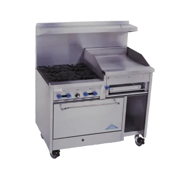 Create culinary wonders with the Comstock-Castle F3430-24B Range, 48" Restaurant, Gas. This top-of-the-line range is designed to meet the demands of a commercial restaurant kitchen, offering exceptional performance and durability. With four 24000 BTU star burners and 12" square cast iron grates, you can easily cook multiple dishes simultaneously, ensuring efficient and precise cooking. The range also features a 24" x 3/4" thick raised griddle/cheesemelter with a flame spreader, perfect for melting cheese or grilling sandwiches to perfection. The 18" wide x 18" deep melting rack below the griddle provides additional space for melting ingredients. The extra-wide 31" oven with enamel lining and oven rack allows for baking and roasting with consistent results. The 10" wide cabinet base storage area enclosed on 3 sides offers convenient storage for your cooking essentials. Made with a stainless steel exterior, back riser, and high shelf, this range is not only functional but also visually appealing. With its 6" stainless steel legs, it provides stability and easy cleaning. The Comstock-Castle F3430-24B Range, 48" Restaurant, Gas is a must-have for any commercial kitchen, delivering exceptional performance and reliability.