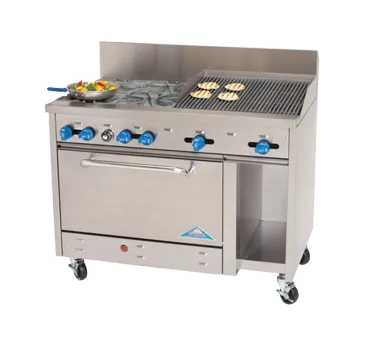 Set the culinary standard with versatile cooking tools. The Comstock-Castle F3430-2RB Range is the perfect addition to any commercial restaurant kitchen. With its 48" width, this gas range offers ample cooking space for all your culinary creations. It features four 24000 BTU star burners with 12" square cast iron grates, ensuring even heat distribution and efficient cooking. The 24" char-broiler with iron radiants adds a delicious smoky flavor to your dishes. The extra-wide 31" oven with enamel door and bottom linings provides plenty of room for baking and roasting, while the rack with three positions allows for versatile cooking options. The 10" wide cabinet base storage area, enclosed on three sides with galvanized steel interior, offers convenient storage for your kitchen essentials. Made with a stainless steel exterior and a 7" high backguard, this range is not only durable but also easy to clean. With a total of 176000 BTU, this NSF and cETLus certified range is a reliable and efficient choice for any commercial restaurant.