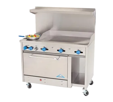 Equip your kitchen for culinary success with the Comstock-Castle F3430-48 Range. This 48" gas range is designed specifically for commercial restaurant use, making it the perfect addition to any professional kitchen. The range features a 48" - 3/4" thick griddle with manual controls, allowing for precise temperature control and even cooking. The extra wide 31" oven is equipped with enamel door and bottom linings, ensuring durability and easy cleaning. With one rack and three positions, you can easily accommodate multiple dishes at once. The 10" wide cabinet base storage area, enclosed on three sides with galvanized steel interior, provides ample space for storing kitchen essentials. Made with a stainless steel exterior, back riser, and high shelf, this range is not only functional but also visually appealing. With 6" stainless steel legs and a cook surface height of 37", this range offers convenience and comfort. With a powerful 110000 BTU, this range delivers exceptional cooking performance. NSF and cETLus certified, this range meets the highest standards of safety and quality. Upgrade your restaurant kitchen with the Comstock-Castle F3430-48 Range and experience the difference in efficiency and performance.