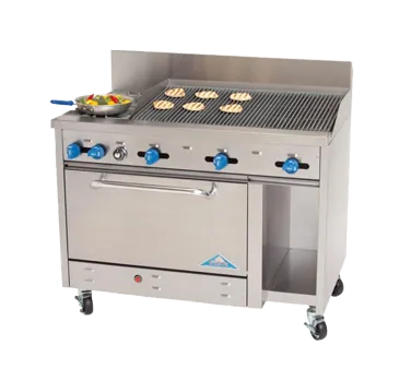 Set the culinary standard with versatile cooking solutions. The Comstock-Castle F3430-4RB Range is the perfect addition to any commercial restaurant kitchen. With its 48" width, this gas range offers ample cooking space for busy kitchens. The range features a 48" char-broiler with iron radiants, allowing you to achieve that perfect sear on your meats and vegetables. The extra wide 31" oven comes with enamel door and bottom linings, ensuring even heat distribution for consistent cooking results. The oven also includes a rack with 3 positions, providing flexibility for different cooking needs. The 10" wide cabinet base storage area, enclosed on 3 sides with galvanized steel interior, offers convenient storage for your kitchen essentials. Made with a stainless steel exterior and a 7" high backguard, this range is not only durable but also easy to clean. With 6" stainless steel legs, it stands at a comfortable 37" tall to the cook surface. With a powerful 130000 BTU, this range delivers exceptional performance. NSF and cETLus certified, this Comstock-Castle range is built to meet the highest standards of quality and safety. Upgrade your restaurant kitchen with the Comstock-Castle F3430-4RB Range and experience the difference in cooking efficiency and versatility.