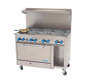Enhance your culinary offerings with precision equipment. Introducing the Comstock-Castle F3430 Range, a must-have for any commercial restaurant. This gas range is designed to meet the demands of a busy kitchen, with its 48" width and eight 24000 BTU star burners. The 12" square cast iron grates provide even heat distribution, ensuring consistent cooking results. The extra-wide 31" oven features enamel door and bottom linings, along with a rack with three positions for versatile baking options. With its stainless steel exterior, back riser, and high shelf, this range not only delivers exceptional performance but also adds a touch of elegance to your kitchen. The 6" stainless steel legs provide stability and durability, while the 37" height to the cook surface ensures comfortable cooking. With a powerful 222000 BTU output, this NSF and cETLus certified range is a reliable and efficient choice for any commercial kitchen.