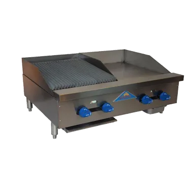 Create culinary wonders with state-of-the-art equipment. Introducing the Comstock-Castle FHP36-18-1.5RB Griddle / Charbroiler, Gas, Countertop. This versatile unit is designed to meet the demands of a commercial restaurant setting. With a 36" wide x 28" deep frame, it offers ample cooking space for preparing a variety of dishes. The unit features a char-broiler and griddle combination, allowing you to grill and griddle simultaneously. The cast iron grates and iron radiants ensure even heat distribution for perfect results every time. The stainless steel splash guards on three sides help contain any mess, while the stainless steel exterior adds durability and a sleek look. Equipped with four manual controls, this unit offers precise temperature control for different cooking needs. With a powerful 76000 BTU output, this griddle/charbroiler delivers exceptional performance. NSF and ETL certified, this Comstock-Castle unit guarantees safety and reliability. Upgrade your kitchen with the Comstock-Castle FHP36-18-1.5RB and elevate your culinary creations.