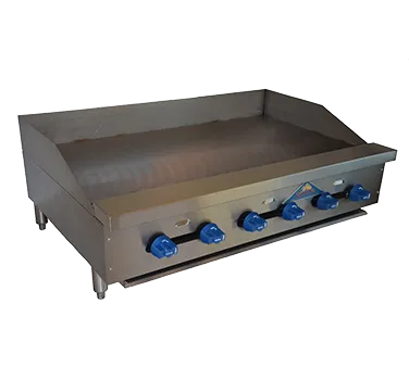 Enhance your culinary space with top-notch equipment. Introducing the Comstock-Castle FHP42-42 Gas Countertop Griddle, a must-have for any commercial restaurant. This high-quality griddle is designed to meet the demands of a busy kitchen, offering a spacious 42" wide x 28" deep frame and a 42" x 21" x 3/4" thick griddle plate. The 4" splash guard on the back and ends ensures a clean cooking environment, while the 3-1/2" wide front grease trough and large removable grease drawer make cleaning a breeze. With its stainless steel exterior and 4" stainless steel legs, this griddle is not only durable but also easy to maintain. Equipped with six manual controls and delivering an impressive 108,000 BTU, this NSF and ETL certified griddle guarantees efficient and precise cooking results. Upgrade your restaurant's cooking capabilities with the Comstock-Castle FHP42-42 Gas Countertop Griddle.