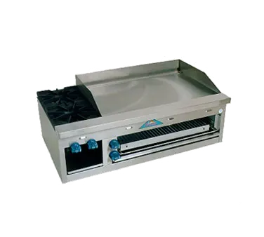 Stay competitive with innovative culinary gear. Introducing the Comstock-Castle FHP48-36B Griddle / Hotplate, Gas, Countertop. This versatile unit is designed to meet the demands of a commercial restaurant setting. With its 48" wide frame and 28" deep surface, it provides ample space for cooking multiple dishes simultaneously. The two 24000 BTU cast iron star pattern hotplate burners ensure quick and efficient heating, while the 36" x 21" x 3/4" thick griddle plate offers a smooth cooking surface for pancakes, burgers, and more. The pull-out cheesemelter rack adds a finishing touch to your dishes, while the stainless steel exterior ensures durability and easy cleaning. With four manual controls and two gas connections, this unit offers precise temperature control and flexibility. Upgrade your kitchen with the Comstock-Castle FHP48-36B and elevate your culinary creations to new heights.