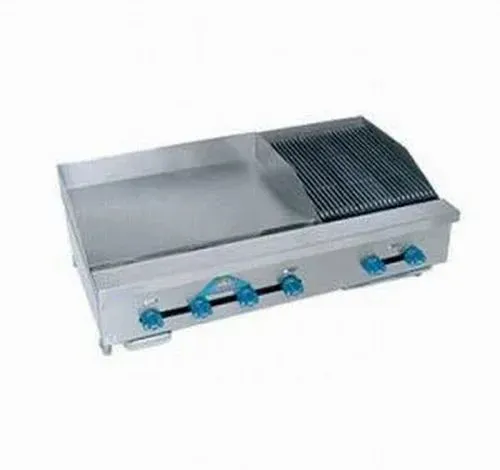 Elevate your culinary operations with our premium Char-Broiler/Griddle Combination, an essential addition for any professional kitchen, offering unparalleled versatility and performance. Designed for countertop use, this gas-powered unit boasts a robust 54" wide by 28" deep stainless steel frame, ensuring both durability and style. The impressive 30" x 21" x 3/4" thick griddle plate provides ample cooking space for a variety of dishes, while the 24" x 21" cooktop broil area, complete with cast iron broiler grates, allows for perfect searing and grilling. Experience the flexibility of both sloped and flat iron radiant surfaces, tailored to suit your cooking needs. Featuring stainless steel splash guards on three sides, this unit ensures a clean and safe cooking environment. The adjustable 4" stainless steel legs offer stability on any surface, while the dual thermostatic griddle controls and manual char-broiler controls provide precision in temperature management. With a powerful 138,000 BTU output and a 3/4" gas connection, this unit delivers consistent, high-performance heat. Certified by NSF and ETL, it meets the highest standards of safety and quality. Transform your kitchen with this versatile and efficient Char-Broiler/Griddle Combination and unleash your culinary creativity.