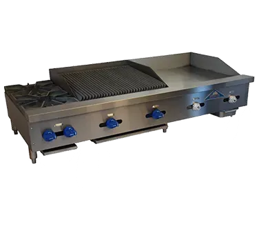 Stay ahead in the ever-evolving culinary landscape with the Comstock-Castle FHP60-24T-2LB Griddle / Charbroiler. This versatile countertop gas unit is designed to meet the demands of commercial restaurant kitchens. With a 60" wide x 28" deep frame, it offers ample cooking space for high-volume operations. The unit features two 24,000 BTU cast iron star pattern hotplate burners, perfect for searing and simmering. Additionally, it includes a 24" x 21" x 3/4" thick griddle plate and a 24" x 21" cooktop broil area, allowing for a variety of cooking techniques. The cast iron char-broiler grates and lava rock with cast iron bottom grates provide authentic charbroiled flavors. Made with a stainless steel exterior and equipped with four-inch stainless steel legs, this unit is durable and easy to clean. With manual controls and griddle thermostat controls, precise temperature adjustments are effortless. The Comstock-Castle FHP60-24T-2LB Griddle / Charbroiler is NSF and ETL certified, ensuring its reliability and safety in a commercial kitchen.