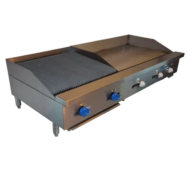 Seamless solutions for crafting exceptional culinary experiences. Introducing the Comstock-Castle FHP60-36-2RB Griddle / Charbroiler, Gas, Countertop. This versatile unit is designed to meet the demands of commercial restaurant kitchens, offering a combination of a char-broiler and griddle in one compact countertop unit. With a 60" wide x 28" deep frame, it provides ample cooking space for high-volume operations. The unit features a 24" x 21" cooktop broil area with cast iron grates and iron radiant for even heat distribution and excellent searing capabilities. Additionally, it includes a 36" x 21" x 3/4" thick griddle plate, perfect for cooking breakfast items, burgers, and more. The stainless steel splash guards on three sides ensure a clean cooking environment, while the stainless steel exterior and 4" stainless steel legs provide durability and stability. With manual controls and a powerful 115000 BTU output, this NSF and ETL certified unit is a reliable and efficient addition to any commercial kitchen.
