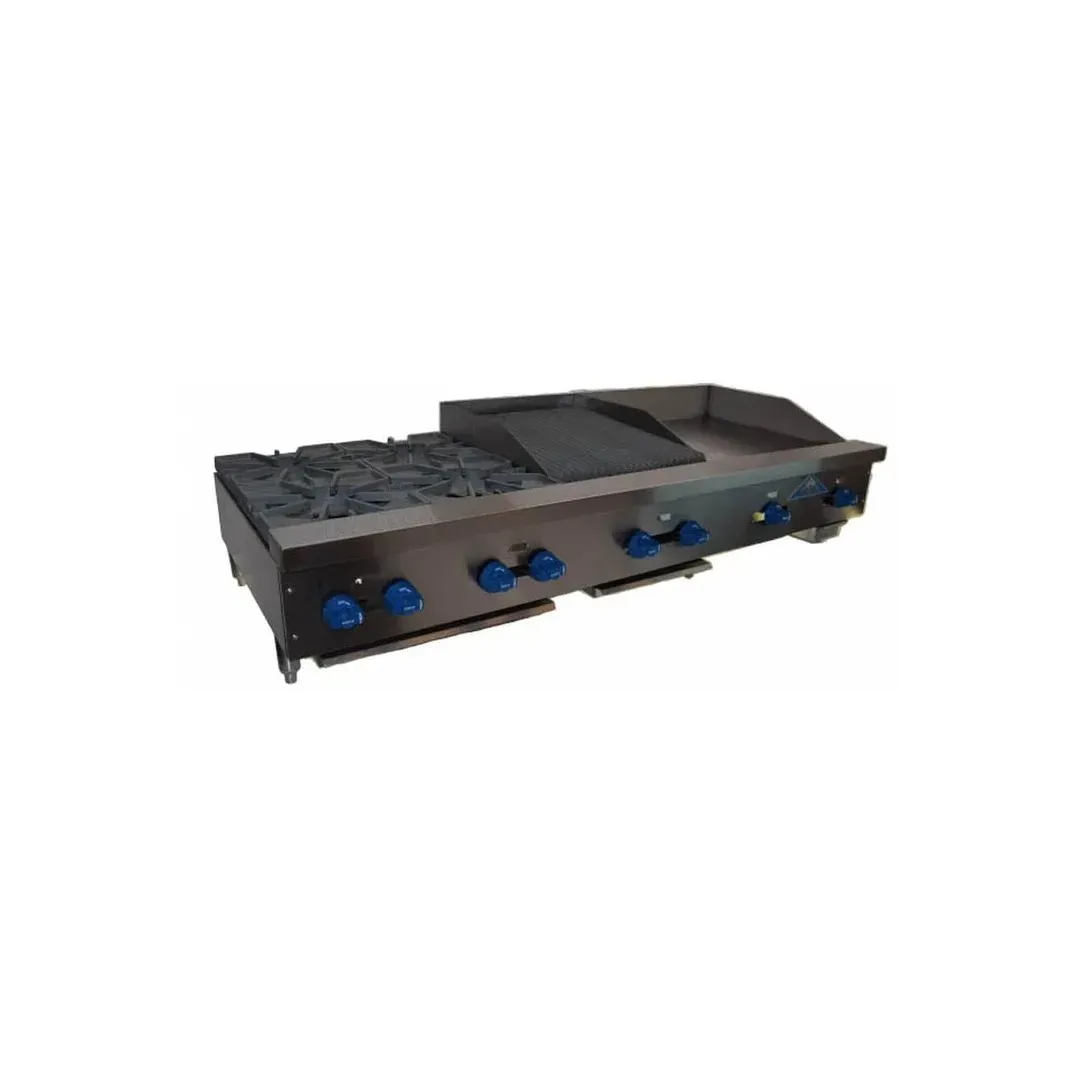 Experience the ultimate in culinary versatility with this all-in-one Hotplate/Griddle/Char-Broiler combination, designed specifically for professional chefs and serious home cooks. Engineered for maximum performance and efficiency, this countertop powerhouse boasts a robust 72" wide by 28" deep frame, making it an ideal choice for any commercial kitchen. It features four high-performance star burners, with front burners delivering 24,000 BTU and rear burners packing an impressive 30,000 BTU, ensuring rapid and even heating. The unit's 24" x 21" griddle plate, crafted from durable 3/4" thick material, provides ample space for grilling while maintaining consistent temperatures. Complementing the griddle is the 24" x 21" cooktop broil area, complete with cast iron broiler grates and iron radiants, perfect for achieving that perfect sear. Encased in a sleek stainless steel exterior and supported by sturdy 4" stainless steel legs, this unit combines durability with style. The manual controls offer precision in cooking, while the 224,000 BTU total output ensures that your kitchen remains a hub of productivity. Designed for easy installation, this griddle/charbroiler unit connects to a 3/4" gas line and meets NSF and ETL standards, guaranteeing safety and quality. Elevate your cooking capabilities with this exceptional addition to your culinary arsenal, and prepare to impress with every dish.