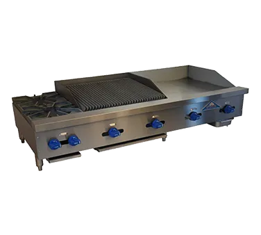 This unit is built to last, with stainless steel splash guards on three sides and a stainless steel exterior for durability and easy cleaning. The four-inch stainless steel legs provide stability and support. With two thermostatic griddle controls, four manual char-broiler controls, and two manual burner controls, you have complete control over your cooking process.