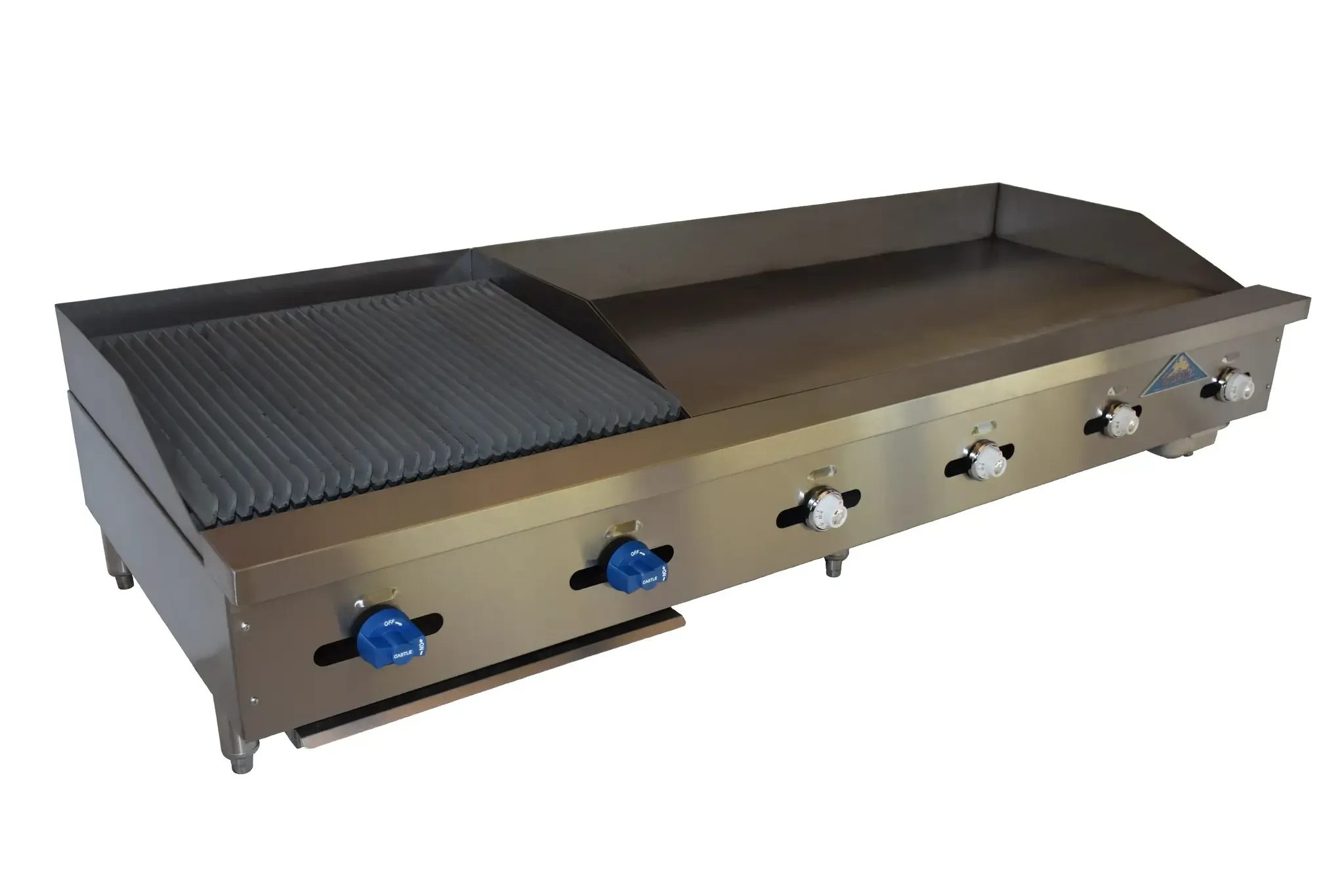 Elevate your culinary creations with our premium Char-Broiler/Griddle Combination, designed for the discerning chef who values precision and versatility. This countertop marvel boasts a robust 72" wide by 28" deep frame, seamlessly integrating a 48" x 21" x 3/4" thick griddle plate alongside a 24" x 21" cooktop broil area. Crafted for superior performance, it features durable cast iron char-broiler grates that can be adjusted to sloped or flat positions, ensuring perfect results every time. With iron radiants and a formidable 166,000 BTU output, this gas-powered unit delivers consistent, high-heat cooking for all your grilling needs. The stainless steel splash guards on three sides and the sleek stainless steel exterior not only enhance durability but also simplify cleaning. Supported by sturdy 4" stainless steel legs, this appliance is built for stability and longevity. With six manual controls, you have the freedom to tailor your cooking experience to your exact specifications. The 3/4" gas connection facilitates easy installation, while NSF and ETL certifications guarantee safety and quality standards are met. Ideal for bustling commercial kitchens, this char-broiler/griddle combination is your ultimate partner in creating mouthwatering dishes with ease and efficiency.