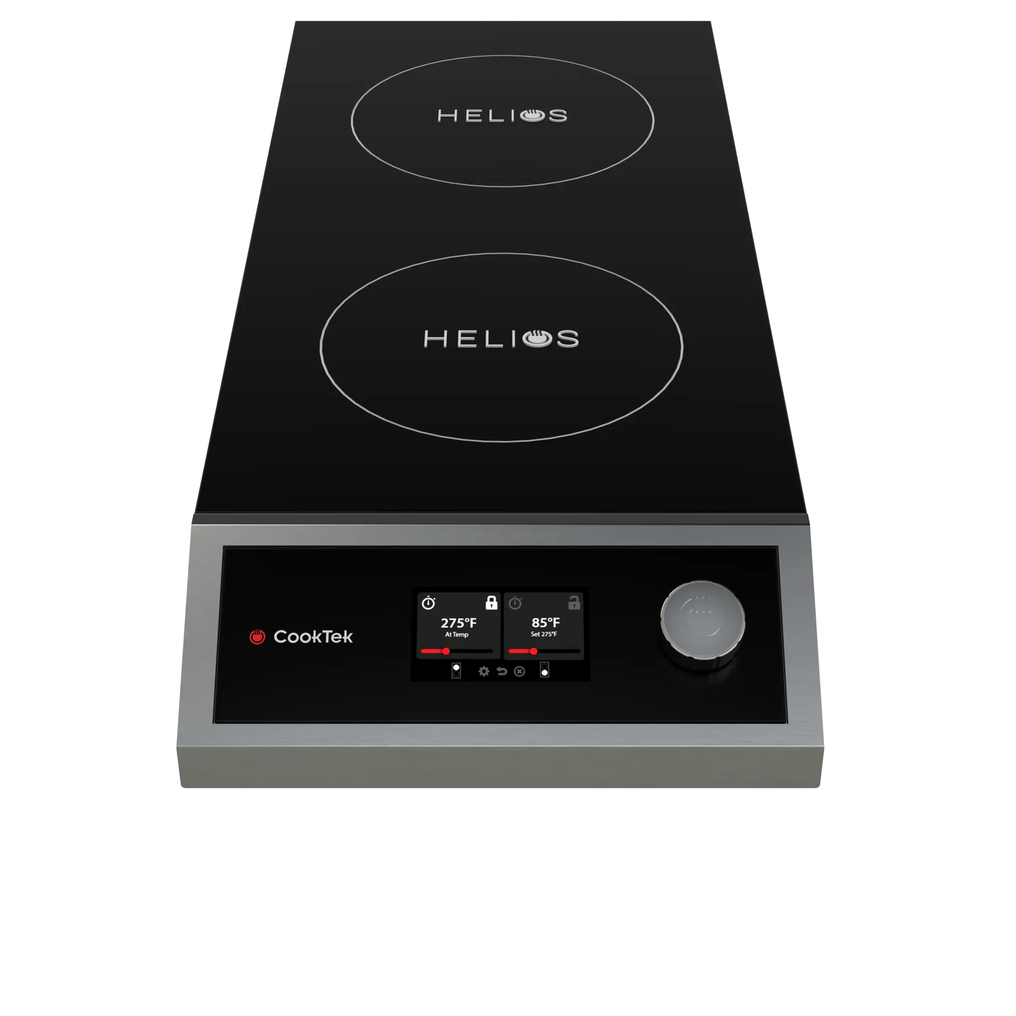 CookTek’s 2500 watt double hob countertop induction cooktop with HELIOS controls offer an efficient, powerful, and user-friendly solution for both commercial and home kitchens, making them a popular choice for chefs and food enthusiasts alike.Even Heating: Induction technology ensures even and consistent heating across the entire pan surface. This results in precise temperature control, which is crucial for achieving perfect dishes.Energy Efficiency: These cooktops are 170% more efficient than gas burners. This means they waste less energy and are more environmentally friendly, making them a sustainable choice for cooking.Precise Temperature Control: The HELIOS controls offer precise power control, allowing chefs to fine-tune the heat for different cooking techniques and recipes. This level of control is challenging to achieve with traditional gas burners.Powerful Performance: Induction cooktops heat up rapidly, significantly reducing cooking time. With three times the power of a gas burner, these cooktops can handle high-heat cooking, such assautéing, searing, and boiling, with ease. The increased power allows for faster cooking and better results.Adaptability: Portable countertop induction cooktops are versatile and can be placed in various locations within a kitchen, while drop-in cooktops seamlessly integrate into kitchen counters. You can configure the hobs side to side or front to back. This adaptability makes them suitable for different kitchen setups and configurations.Easy-to-Clean Surfaces: The cooktop’s flat surface is easy to clean, reducing the time and effort required for post-cooking cleanup. This is particularly important in commercial kitchens, where quick turnover between dishes is essential.Safety Features: Induction technology has no open flames. This is a fundamental safety benefit, as it eliminates the risk of gas leaks, flare-ups, or accidental fires associated with traditional gas burners. Induction cooktops generate heat through electromagnetic fields, which only heat the cookware placed on the surface. The cooktop itself remains cool to the touch, minimizing the risk of burns or accidental contact with hot surfaces.These safety features make induction cooktops a safer choice for both professional chefs and home cooks, reducing the likelihood of kitchen accidents and making them a preferred option in many kitchens.