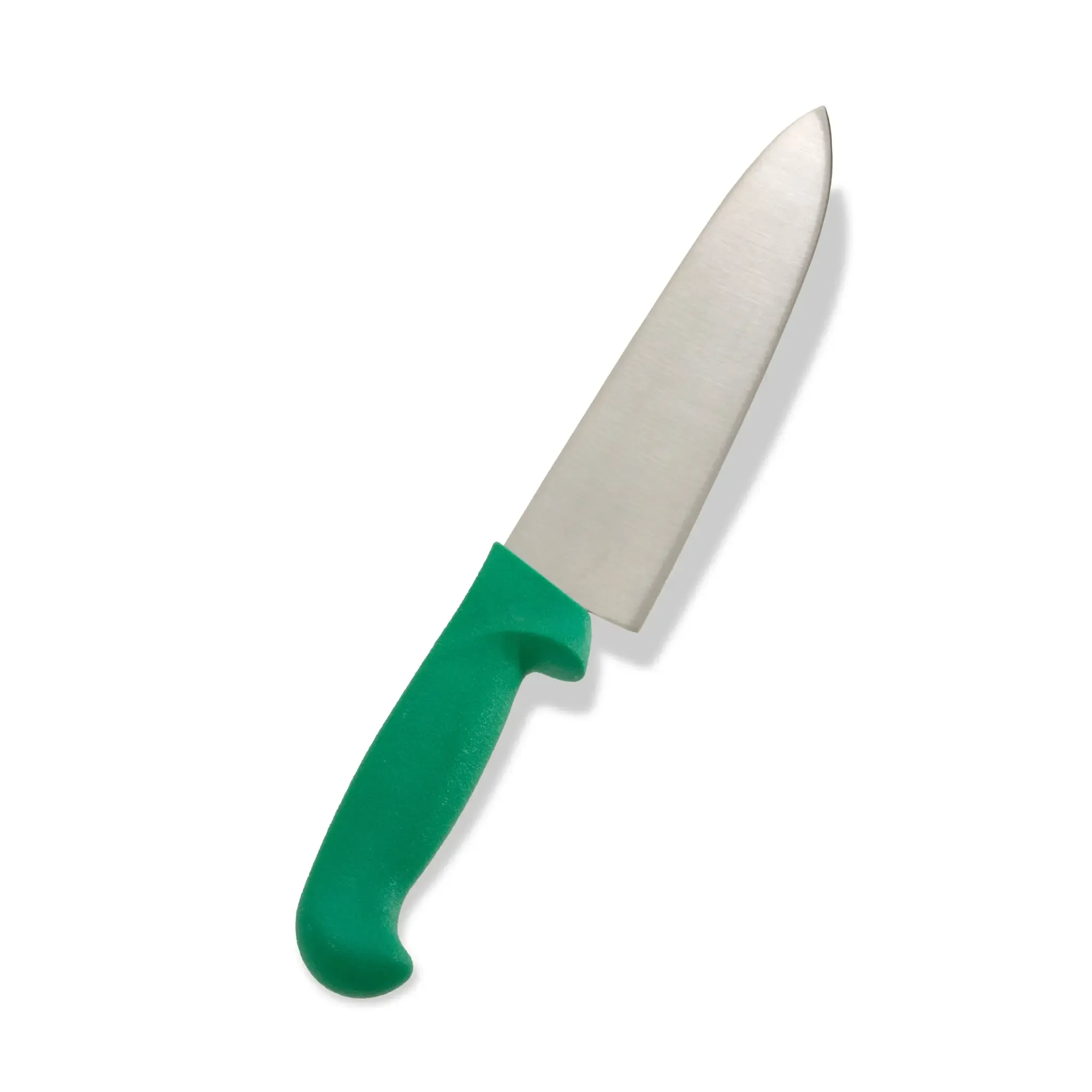 Seamless tools for crafting culinary excellence. Introducing the Crestware KN30G Chef Knife, a must-have for any commercial restaurant. This high-quality knife is designed to elevate your culinary skills and deliver exceptional results. With its 8-inch high carbon German steel blade, this knife offers superior sharpness and durability, ensuring precise and effortless cutting. The polypropylene handle provides a comfortable grip, allowing for extended use without fatigue. The vibrant green color adds a touch of style to your kitchen while also promoting food safety and hygiene. NSF certified, this knife meets the highest standards of quality and safety. Packaged in a convenient clam pack for display, the Crestware KN30G Chef Knife is perfect for professional chefs and culinary enthusiasts alike. Elevate your culinary creations with the Crestware KN30G Chef Knife.