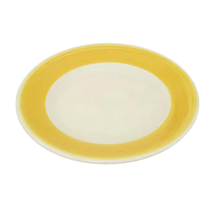 Elevate your culinary offerings with precision cooking gear. Introducing the Crestware PICR42Y Plate, China. This ceramic plate is designed to enhance the presentation of your dishes, making them look even more appetizing. With a 6-3/4" diameter and a rolled edge, it provides a stylish and professional touch to any table setting. The yellow wide rim adds a pop of color, making your food stand out. Made from vitrified material, this plate is oven and microwave safe, allowing for easy reheating and serving. Its durable construction ensures long-lasting use in a busy commercial restaurant environment. Whether you're serving appetizers, entrees, or desserts, the Crestware PICR42Y Plate, China is the perfect choice for showcasing your culinary creations and impressing your customers.