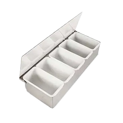 Equip your kitchen for superior culinary mastery with the Crestware SCD5 Bar Condiment Holder. This stainless steel condiment dispenser is designed specifically for commercial restaurant use, ensuring durability and functionality. With five compartments and included inserts, you can easily organize and display a variety of condiments, making it convenient for both staff and customers. The high impact Plexiglas construction provides visibility and allows for quick refills, while the sturdy frame and hinge ensure long-lasting performance. Measuring 15" x 6" x 3-1/2", this condiment holder is compact enough to fit on any countertop or bar, maximizing space efficiency. Elevate your dining experience with the Crestware SCD5 Bar Condiment Holder.