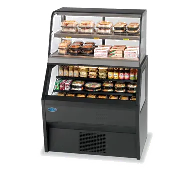 Transform your restaurant's ambiance with the Federal Industries CH4828/RSS4SC Display Case. This specialty hybrid merchandiser is designed to enhance your commercial restaurant setting while showcasing your delectable offerings. The refrigerated self-serve bottom features a sleek black laminated exterior with black trim, complemented by horizontal top and front lights that beautifully illuminate your products. With two tiers of black metal shelves and tempered glass ends, this display case provides ample space to showcase your culinary creations. The hot service top boasts a front glass with black trim, a top light with lighted shelves, and adjustable stainless steel heated shelves to keep your dishes warm and inviting. The stainless steel deck with a humidified air system ensures optimal food preservation. With sliding rear doors and a 1/2 HP motor, this display case combines functionality and style. Elevate your restaurant's presentation with the Federal Industries CH4828/RSS4SC Display Case.