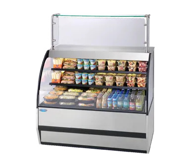 Introducing the Federal Industries SSRVS3642 Display Case, Refrigerated, Self-Serve a versatile and elegant addition to any commercial restaurant. This specialty display offers a top service area over a refrigerated self-serve deli merchandiser, perfect for showcasing a variety of delectable treats. With its adjustable temperature control and self-contained refrigeration system, you can ensure that your products stay fresh and at the perfect temperature. The LED horizontal top and shelf lights illuminate your offerings, while the stainless steel top service area exudes a sleek and professional look. The two tiers of adjustable solid black metal shelves provide ample space for displaying your culinary creations. The tempered glass ends and black interior add a touch of sophistication, while the rear-mounted appliance receptacle allows for easy installation. With its DOE 2012 compliance and cULus, UL, and UL EPH CLASSIFIED certifications, this display case is both reliable and safe. Elevate your restaurant's presentation with the Federal Industries SSRVS3642 Display Case.