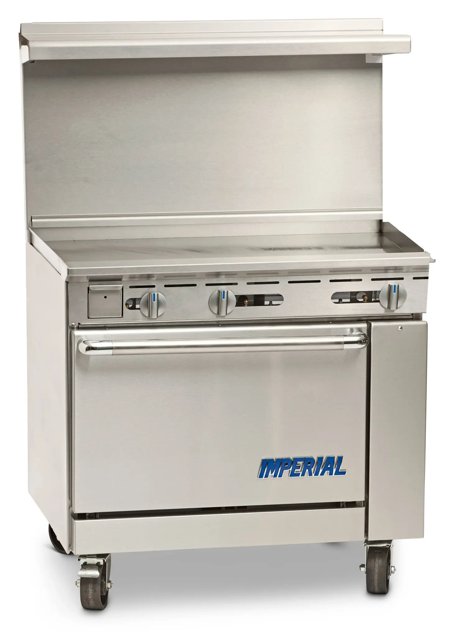 Experience kitchen innovation with the Imperial IR-G36 Range, a top-of-the-line gas restaurant range designed to elevate your culinary creations. This 36" range features a griddle and a standard oven, providing versatility and efficiency in one compact unit. The manual controls allow for precise temperature adjustments, ensuring consistent cooking results every time. The 3" grease trough, removable grease can, and crumb tray make cleaning a breeze, saving you valuable time in a busy restaurant kitchen. Crafted with a stainless steel front, sides, backguard, landing ledge, and kick plate, this range is not only durable but also adds a sleek and professional look to your kitchen. With a powerful 95000 BTU, this range delivers exceptional cooking performance, allowing you to handle high-volume cooking with ease. NSF, CE, CSA Flame, and CSA Star certifications guarantee the quality and safety of this product. Upgrade your restaurant kitchen with the Imperial IR-G36 Range and experience the difference in efficiency and performance.