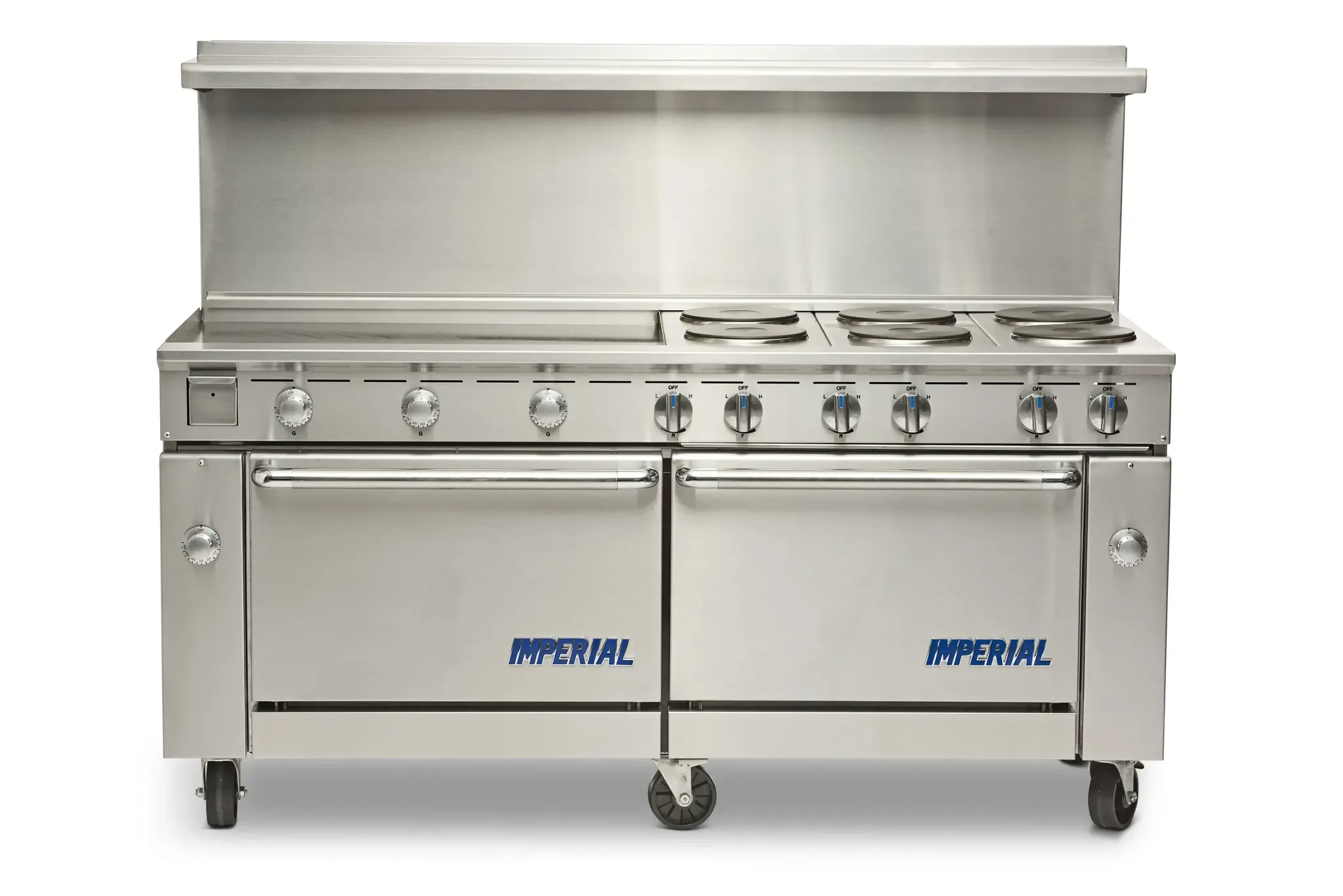 Culinary artistry redefined with the Imperial IR-G60T-E-CC Range, 60" Restaurant, Electric. This top-of-the-line restaurant range is designed to meet the demands of a busy commercial kitchen. With its 60" size, it provides ample cooking space for preparing multiple dishes simultaneously, making it perfect for high-volume restaurants. The griddle feature allows for versatile cooking options, while the two convection ovens ensure even and efficient cooking results. The thermostatic controls provide precise temperature management, allowing chefs to achieve perfect cooking results every time. The three chrome racks per oven offer plenty of space for baking multiple items at once. The removable grease can and crumb tray make cleaning a breeze, while the porcelain oven interior ensures durability and easy maintenance. With its stainless steel construction and adjustable feet, this range is built to withstand the rigors of a commercial kitchen. Trust Imperial for exceptional quality and performance.