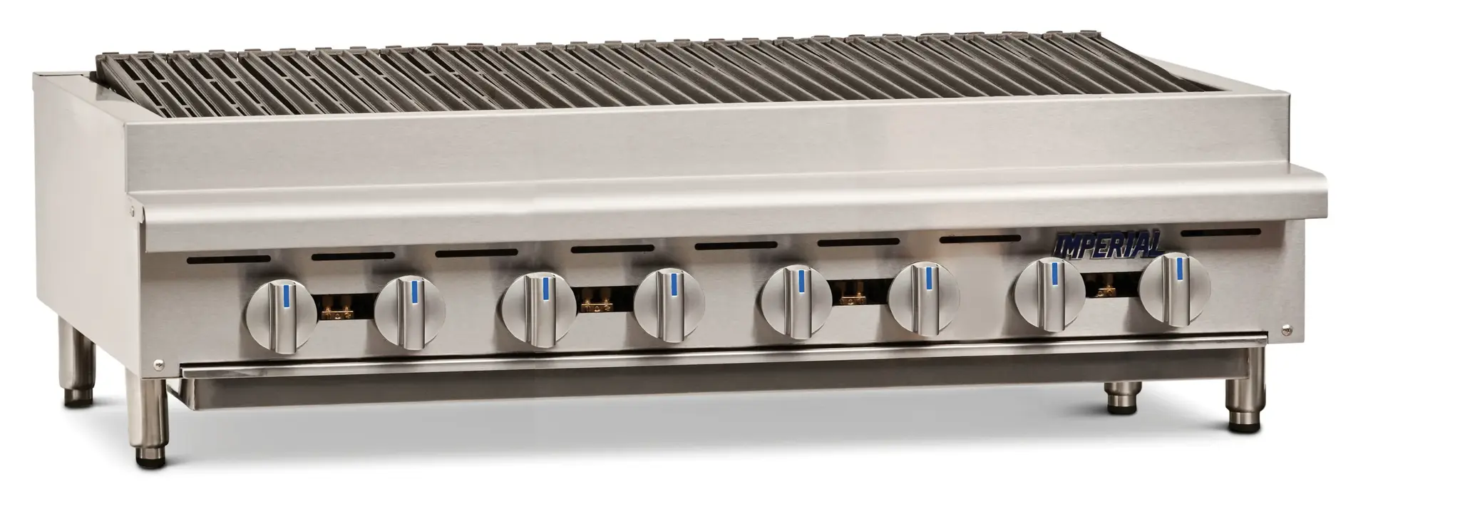 Kitchen innovation at its best, the Imperial IRB-48 Gas Countertop Charbroiler is a must-have for any commercial restaurant. With its cast iron radiants and slanted top grates, this charbroiler ensures even heat distribution and perfect grill marks on your meats and vegetables. The full-width grease gutter and removable drip pan make cleaning a breeze, while the stainless steel burners guarantee durability and longevity. The front, sides, and landing ledge are also made of stainless steel, adding a sleek and professional look to your kitchen. Equipped with 4" legs and adjustable feet, this charbroiler can be easily customized to fit your countertop height. With a powerful 120,000 BTU, this charbroiler delivers exceptional performance and efficiency. Certified by cETLus, NSF, and CE, you can trust the quality and safety of this Imperial charbroiler. Upgrade your kitchen with the Imperial IRB-48 Gas Countertop Charbroiler and experience the difference in taste and efficiency.