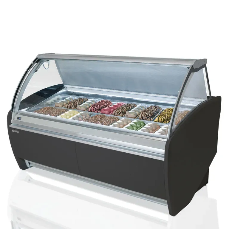 Enhance your gelato presentation with Infrico's Gelato Curved Glass Display, featuring a width of 61-1/2" and a spacious 15.2 ft3 capacity for 16 pans. This display unit ensures a temperature range of -2°F to 5°F, driven by a 1+1/2 HP compressor, drawing 5.4 to 6.1 Amps.