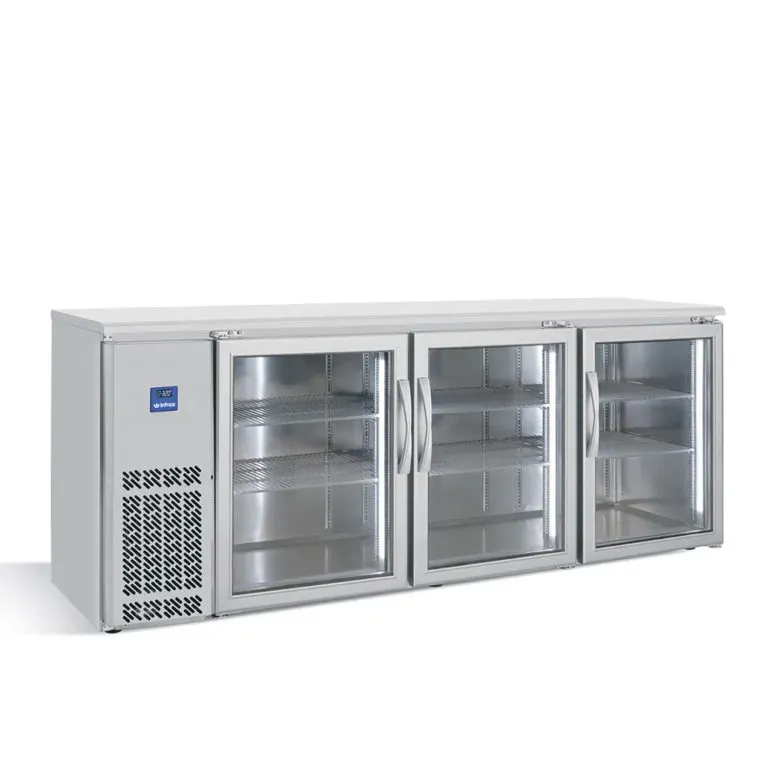 Infrico's Back Bar Cooler with 3 glass doors offers ample storage space for a variety of beverages. With a temperature range of 33°F to 38°F, a 1/3 HP compressor, and drawing 6 Amps, this cooler is ideal for establishments looking to keep a diverse drink selection at the perfect temperature.