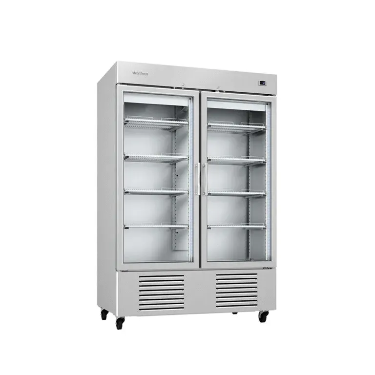 Enhance product visibility and storage with Infrico's 2 Glass Door Refrigerator, featuring a 49 ft3 capacity, two glass doors, and eight shelves. The 1/3 HP compressor drawing 4.9 Amps ensures efficient cooling within a temperature range of 33°F to 38°F.