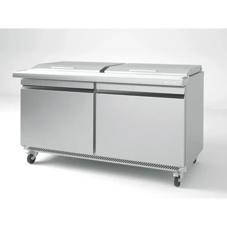 Infrico's 14ft Solid Door Refrigerator with 2 doors and 18 pans Megatop design offers enhanced organization and accessibility. With a temperature range of 35°F to 41°F, a 1/4 HP compressor, and drawing 4.1 Amps, this unit is designed to optimize your sandwich and salad preparation workflow.