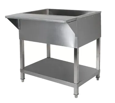 Revamp service with the Klingers Trading CP4 Serving Counter, Cold Food. This versatile option is perfect for commercial restaurant use, offering a convenient and efficient way to serve chilled dishes. The CP4 features an 8" deep fiberglass insulated ice-cooled well, ensuring that your food stays fresh and at the perfect temperature. The stainless steel serving shelf provides ample space for plating and presentation, while the 18-gauge stainless steel undershelf offers additional storage for utensils and supplies. With a pre-installed drain assembly, cleanup is a breeze. The CP4 is NSF certified, guaranteeing its quality and durability. Whether you're serving salads, desserts, or cold appetizers, this cold pan table is a must-have for any restaurant looking to elevate their food service. Trust Klingers Trading for all your commercial restaurant needs.