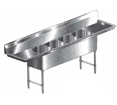 Introducing the Klingers Trading HDS42D Sink, a practical alternative for streamlining setup in your commercial restaurant. Crafted with 16/304 stainless steel construction, this four-compartment sink is built to withstand the demands of a busy kitchen. With four spacious compartments measuring 16"W x 20" front-to-back x 12" deep, you'll have ample space for washing, rinsing, and sanitizing dishes. The 9"H backsplash and two sets of 8" O.C splash mount faucet holes ensure a clean and efficient workspace. Equipped with two 18" drainboards, stainless steel gussets, legs, crossbracing, and adjustable bullet feet, this sink offers stability and durability. ETL certified, it meets the highest safety standards. Whether you're running a bustling restaurant or a catering service, the Klingers Trading HDS42D Sink is the perfect addition to your kitchen, providing convenience, efficiency, and reliability.
