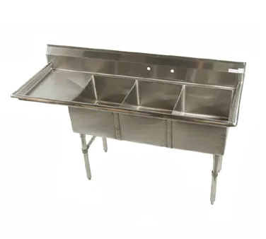 Introducing the Klingers Trading MCS3DL Sink, a practical alternative for streamlining setup in commercial restaurants. This three-compartment sink is designed to enhance efficiency and functionality in any busy kitchen. With its stainless steel construction, this sink is built to withstand the demands of a commercial environment. The three 15" x 15" x 11" deep compartments provide ample space for washing, rinsing, and sanitizing dishes, while the 8-1/2" backsplash helps maintain a clean and hygienic workspace. The 15" left drainboard offers convenient drying and storage space. Equipped with 8" OC splash mount faucet holes, stainless steel gussets, legs, crossbracing, and bullet feet, this sink ensures stability and durability. NSF certified, this sink meets the highest standards of cleanliness and sanitation. Upgrade your restaurant's dishwashing area with the Klingers Trading MCS3DL Sink and experience improved efficiency and hygiene.