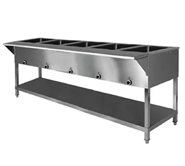 Revamp service with the Klingers Trading SW5H208 Serving Counter. This versatile electric table is designed for commercial restaurant use, offering a convenient and efficient way to keep your hot food items at the perfect temperature. With its 5-pan capacity and individual thermostatic controls, you can easily customize the heat settings for each well, ensuring that every dish is served just right. The 18-gauge stainless steel undershelf provides durability and ample storage space for your kitchen essentials. The fiber glass insulation and manifold drain assembly help maintain the temperature and keep your workspace clean and organized. With 825 watts of power and a cord with NEMA L6-30P, this serving counter is ready to handle the demands of a busy restaurant kitchen. Upgrade your food service operations with the Klingers Trading SW5H208 Serving Counter.