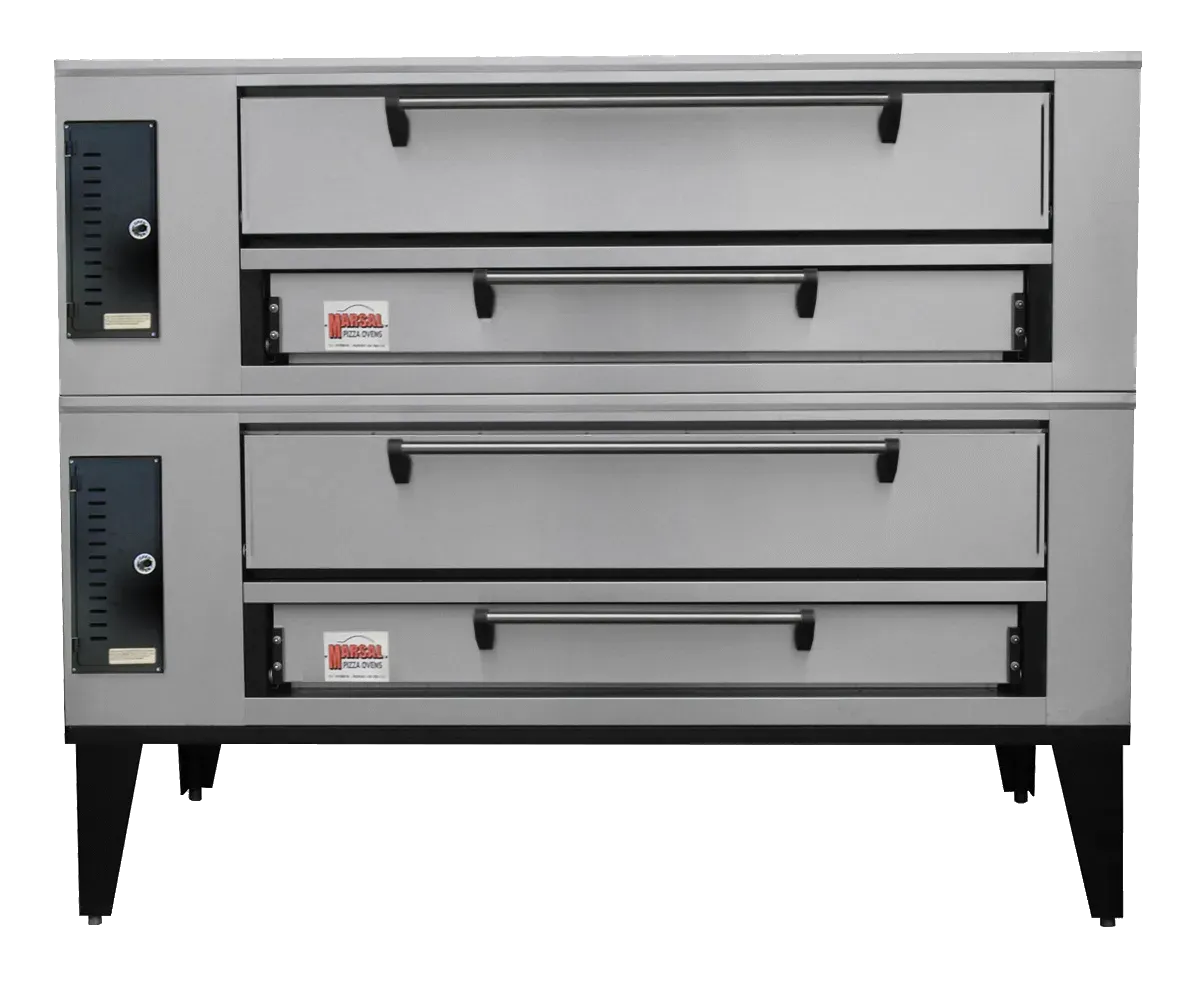 Maximize cooking potential with the Marsal Ovens SD866 STACKED Pizza Oven. This deck-type gas oven is designed for commercial restaurant use, offering two stacked baking chambers that measure 7"H x 44" x 66". Each deck can accommodate up to eight 18" pies, allowing you to efficiently cook large quantities of pizzas at once. The 2" thick brick decks ensure even heat distribution, resulting in perfectly cooked crusts every time. With adjustable thermostats ranging from 300 to 650 degrees Fahrenheit, you have precise control over the cooking temperature. The stainless steel top, front, doors, and sides, along with the aluminized steel interior, make this oven durable and easy to clean. The adjustable legs provide stability and flexibility in positioning. With a powerful 260,000 BTU output, this UL and UL EPH Classified oven is a reliable and efficient addition to any commercial kitchen. Made in the USA by Marsal Ovens, this pizza oven is a must-have for any restaurant looking to enhance their pizza-making capabilities.