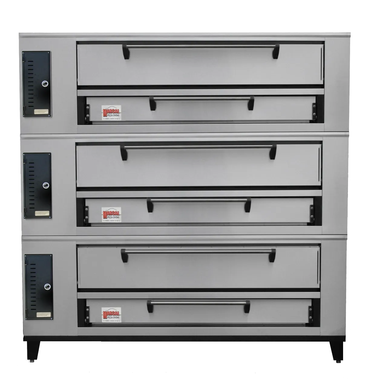 Enhance kitchen operations with the Marsal Ovens SD866 TRIPLE Pizza Oven. This deck-type gas oven is designed to meet the demands of a commercial restaurant setting. With three stacked baking chambers, each measuring 7"H x 44" x 66", you can bake up to 8 delicious 18" pies per deck. The 2" thick brick decks ensure even heat distribution, resulting in perfectly cooked pizzas every time. The oven features adjustable thermostats ranging from 300 to 650 degrees Fahrenheit, allowing you to achieve the desired level of crispiness. Made in the USA, this oven is built to last with its stainless steel top, front, doors, and sides, as well as an aluminized steel interior. The adjustable legs provide stability and convenience. With a powerful 390,000 BTU, this oven delivers exceptional performance. Upgrade your restaurant's pizza-making capabilities with the Marsal Ovens SD866 TRIPLE Pizza Oven.