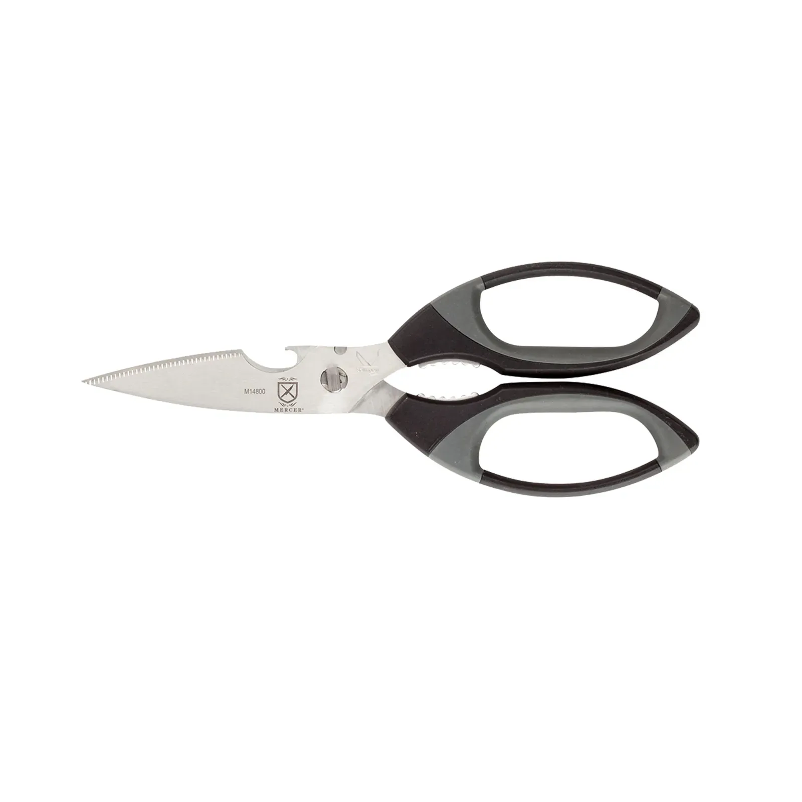 Boost kitchen productivity with Mercer Culinary, M14800P Kitchen Shears. These premium 8 1/2" shears are a must-have tool for any commercial restaurant. Crafted with high carbon German steel, they offer exceptional durability and precision cutting. The plastic handles provide a comfortable grip, ensuring ease of use during busy food preparation. Designed for convenience, these shears can be easily taken apart for thorough cleaning, maintaining optimal hygiene standards. But that's not all - these versatile shears also feature a built-in bottle opener, nutcracker, and lid lifter, making them a multifunctional addition to any kitchen. Packaged in a plastic pouch with a graphic insert, these shears are ready to impress.
