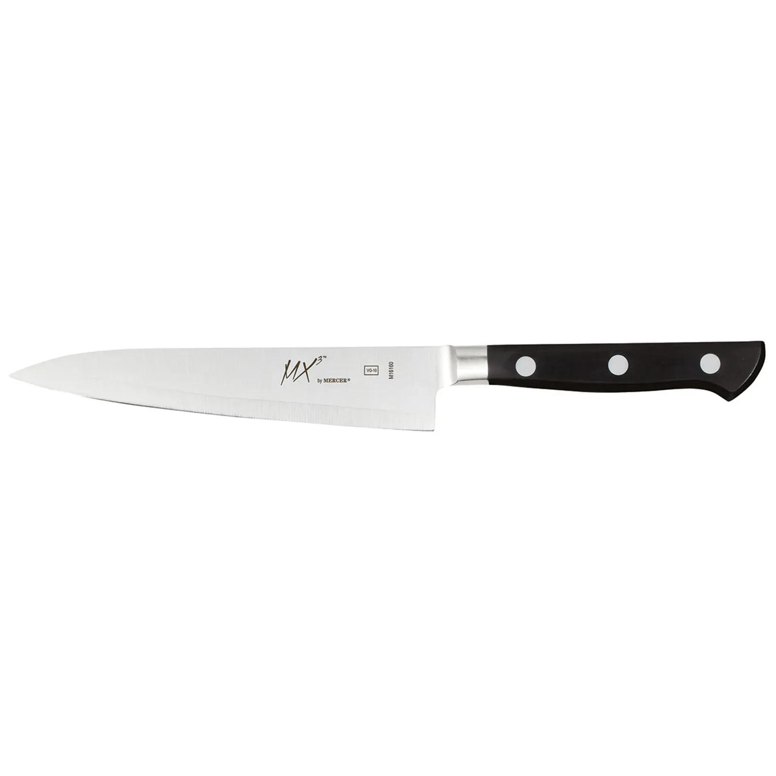 Boost culinary experiences with the Mercer Culinary, M16160, Knife, Asian. This 150mm (6") Petty knife is a must-have tool for any commercial restaurant. Its one-piece, full tang construction ensures durability and stability, while the forged, 3-layer Japanese VG-10 super-steel core blade delivers exceptional sharpness and edge retention. The taper-ground edge allows for precise cutting, making it perfect for intricate tasks like slicing, dicing, and mincing. The ergonomic Delrin handle provides a comfortable grip, reducing fatigue during extended use. With triple riveted construction, this knife offers enhanced strength and longevity. Whether you're a professional chef or a culinary enthusiast, this Mercer Culinary knife is designed to meet the demands of a busy commercial kitchen. Elevate your culinary creations with the Mercer Culinary, M16160, Knife, Asian.