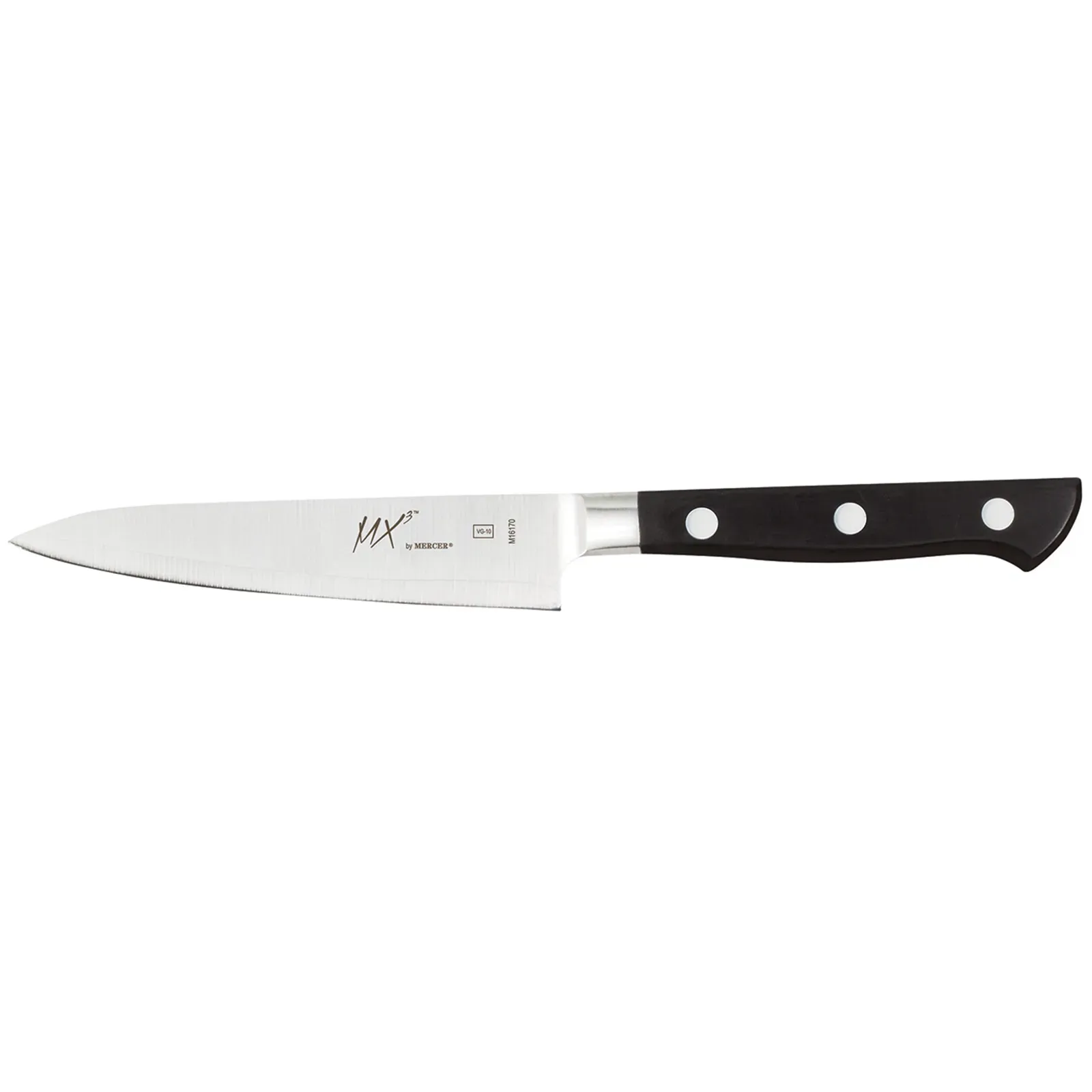 Enhance culinary precision with the Mercer Culinary, M16170, Knife, Asian. This 120mm (5") Petty knife is a must-have tool for any commercial restaurant. Its one-piece, full tang construction ensures durability and stability, allowing for precise and controlled cutting. The forged, 3-layer Japanese VG-10 super-steel core blade provides exceptional sharpness and edge retention, making it perfect for slicing, dicing, and chopping various ingredients. The taper-ground edge allows for effortless cutting motions, reducing fatigue during long hours in the kitchen. The ergonomic Delrin handles offer a comfortable grip, promoting efficiency and safety. With triple riveted construction, this knife is built to withstand the demands of a busy restaurant kitchen. Whether you're a professional chef or a culinary enthusiast, the Mercer Culinary M16170 Knife is a reliable and high-performing tool that will elevate your cooking experience.