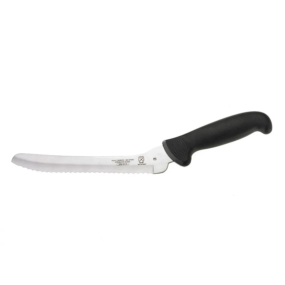 Upgrade culinary efficiency with the Mercer Culinary, M18135BK Knife, Bread / Sandwich. This 8" offset bread knife is designed to enhance your restaurant's bread and sandwich preparation. The wavy edge allows for precise slicing, ensuring consistent results every time. Made with high carbon, stain-resistant steel, this knife is durable and long-lasting, perfect for the demands of a commercial kitchen. The ergonomic black plastic handle provides a comfortable grip, while the textured finger points and protective finger guard ensure safety during use. NSF certified, this knife meets the highest standards of quality and sanitation. Upgrade your kitchen with the Mercer Culinary, M18135BK Knife, Bread / Sandwich and experience the difference in efficiency and precision.