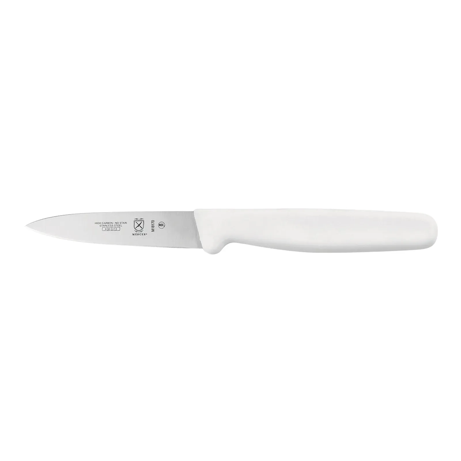 Upgrade culinary efficiency with the Mercer Culinary, M18170 Paring Knife. This 3" knife is the ultimate tool for precision cutting in a commercial restaurant setting. Made with high carbon, stain-resistant steel, this knife ensures long-lasting durability and sharpness. The ergonomic white handle provides a comfortable grip, while the textured finger points and protective finger guard enhance safety during use. With NSF certification, this knife meets the highest standards of quality and hygiene. Whether you're peeling fruits, deveining shrimp, or creating intricate garnishes, this knife delivers exceptional performance. Trust Mercer Culinary for top-notch quality and efficiency in your restaurant kitchen. Upgrade your culinary game today with this essential paring knife.