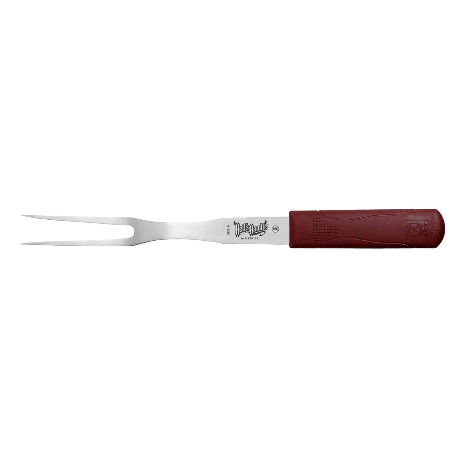 Upgrade culinary efficiency with the Mercer Culinary, M18380, Fork, Cook's. This professional-grade cook's fork is designed to enhance your restaurant's performance. With an 8" blade and 13-1/2" overall length, it provides the perfect balance of precision and control. The stamped, Japanese stainless steel construction ensures durability and longevity, making it ideal for the demands of a commercial kitchen. The heat-resistant handle can withstand temperatures up to 450F, allowing for safe and comfortable use. The dual-textured finish nylon handle provides extra grip and slip resistance, ensuring a secure hold even in fast-paced cooking environments. Precision ground for optimal performance, this fork is NSF certified, guaranteeing its safety and quality.